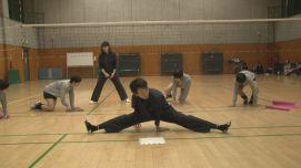 この日は中学生バレーボールチームの選手に体のバランスを整えるトレーニングを中心に指導していました。